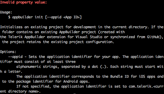 Firstly, thanks for releasing command-line tool for AppBuilder, and Sublime Text integration. I'm trying to clone my AppBuilder project from a GIT repository, and initialize AppBuilder using "appbuilder init", but I get "Invalid property value"