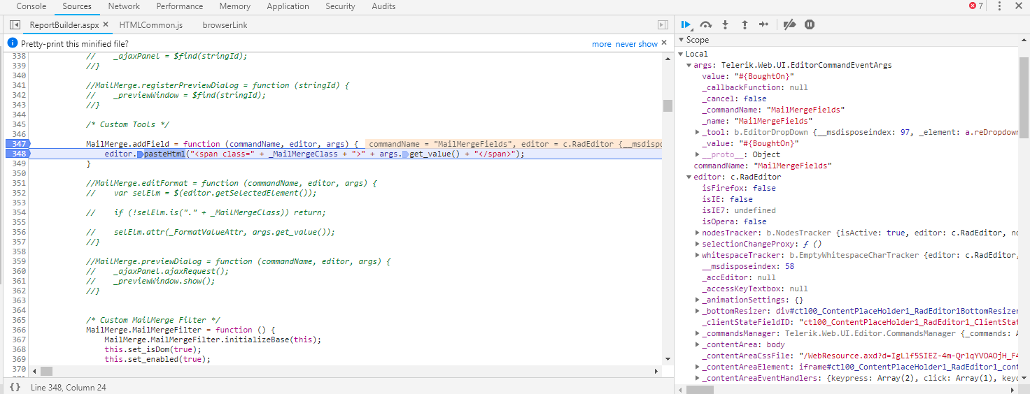 As per the screenshot, it looks like there is a problem with the pasteHtml method of RadEditor.