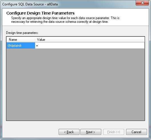 I managed to realize that I was missing a part in my SQL query in where condition (WHERE column = @column). But now I have problems in "Configure Design Time Parameters" window, I'm getting error trying to convert "String" to "DateTime".