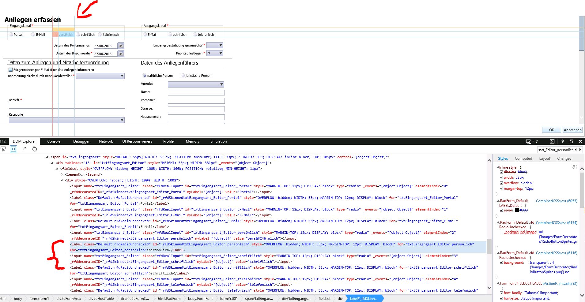 1.public void Eingangskanalpersönlichauswählen()2.{3. var label = new HtmlLabel(this.UIBürgeranliegenerfassWindow.UIBürgeranliegenerfassDocument.UIOpenTextMBPMFormContFrame);4. label.SearchProperties.Add(HtmlLabel.PropertyNames.LabelFor, "txtEingangsart_Editor_persönlich");5. //RadioButton1 represents the id of the asp:RadioButton6. Mouse.Click(label);7.}
