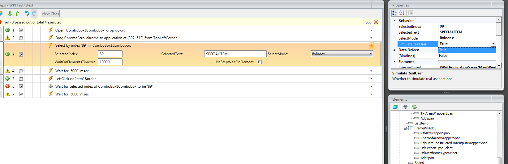 I'm in the process of evaluating Test Studio (the VS plug-in, and the standalone version) for use with a WPF desktop application. I'm trying to make several selections in the standard WPF ComboBox, and check to see that the correct text is selected. When selecting an index which lies within the initial 'viewable' size of the combobox dropdown, the item is selected correctly, and the verification process works. However, when I select the last item (in this case, index 46), which requires scrolling down in the drop-down, the mouse can be seen moving to the bottom of the screen, and then clicking on a start-menu item (and in this case, starting Visual Studio).