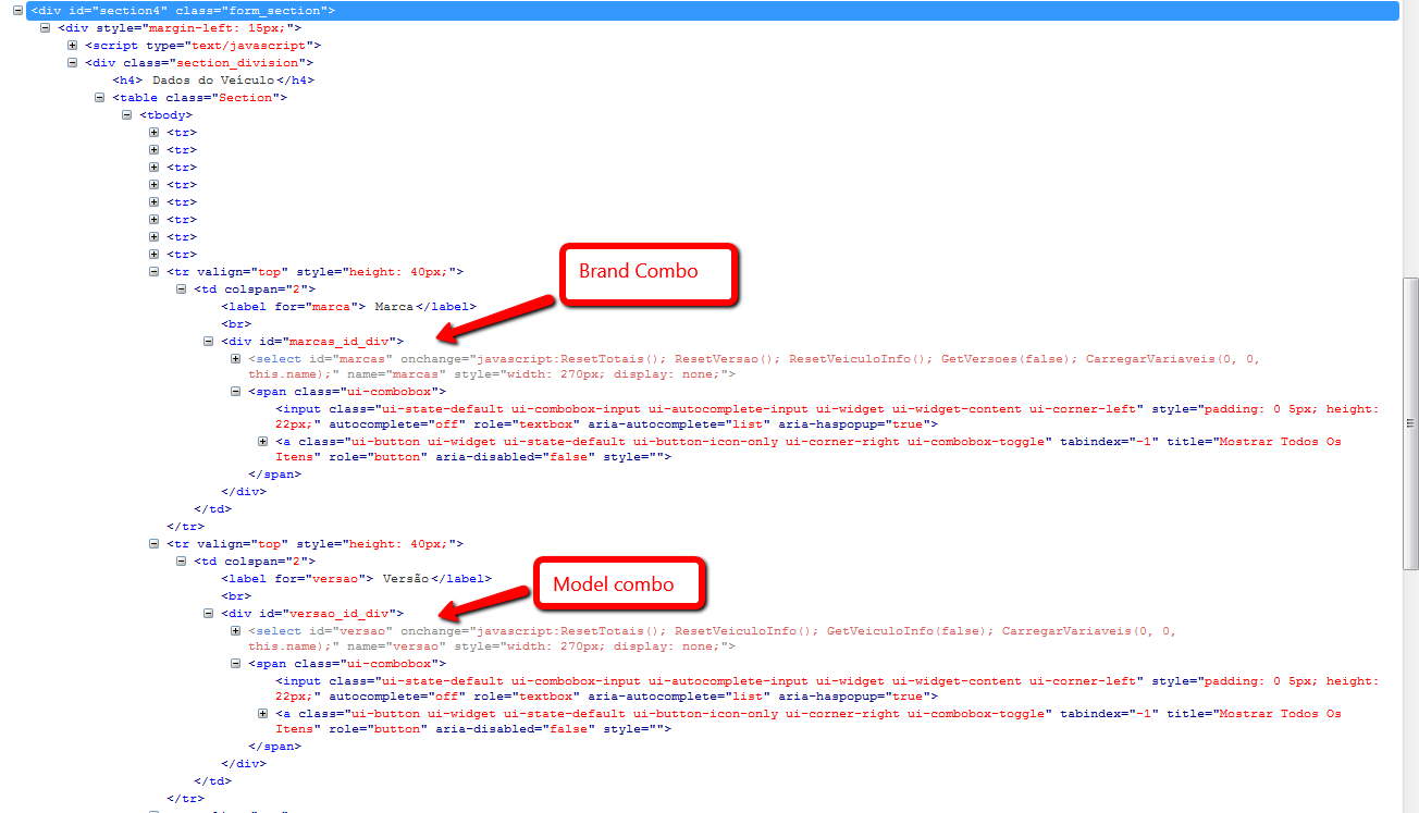 <div id="marcas_id_div"><select id="marcas" onchange="javascript:ResetTotais(); ResetVersao(); ResetVeiculoInfo(); GetVersoes(false); CarregarVariaveis(0, 0, this.name);" name="marcas" style="width: 270px; display: none;"><option value=""> </option><option value="Abarth">Abarth </option><option value="Alfa Romeo">Alfa Romeo </option><option value="Aston Martin">Aston Martin </option><option value="Audi">Audi </option><option value="Bentley">Bentley </option><option value="Bmw">Bmw </option><option value="Chevrolet">Chevrolet </option></select><span class="ui-combobox"><input class="ui-state-default ui-combobox-input ui-autocomplete-input ui-widget ui-widget-content ui-corner-left" style="padding: 0 5px; height: 22px;" autocomplete="off" role="textbox" aria-autocomplete="list" aria-haspopup="true"><a class="ui-button ui-widget ui-state-default ui-button-icon-only ui-corner-right ui-combobox-toggle" tabindex="-1" title="Mostrar Todos Os Itens" role="button" aria-disabled="false" style=""><span class="ui-button-icon-primary ui-icon ui-icon-triangle-1-s"></span><span class="ui-button-text"></span></a></span></div>