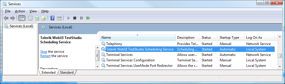 MSI (s) (90:04) [12:36:49:510]: Executing op: ServiceInstall(Name=Telerik.WebUI.TestStudio.SchedulingService,DisplayName=Telerik WebUI TestStudio Scheduling Service,ImagePath="e:\Program Files\Telerik\WebUI Test Studio 2010.3\Bin\Telerik.WebUITestStudio.Scheduling.WindowsService.exe",ServiceType=16,StartType=2,ErrorControl=32768,,,,StartName=LocalSystem,Password=**********,Description=Scheduling automated test runs) MSI (s) (90:04) [12:36:49:635]: Executing op: ActionStart(Name=StartServices,Description=Starting services,Template=Service: [1]) MSI (s) (90:04) [12:36:49:635]: Executing op: ProgressTotal(Total=1,Type=1,ByteEquivalent=1300000) MSI (s) (90:04) [12:36:49:635]: Executing op: ServiceControl(,Name=Telerik.WebUI.TestStudio.SchedulingService,Action=1,Wait=1,) MSI (s) (90:04) [12:37:24:279]: Note: 1: 2205 2: 3: Error MSI (s) (90:04) [12:37:24:279]: Note: 1: 2228 2: 3: Error 4: SELECT `Message` FROM `Error` WHERE `Error` = 1920 Error 1920. Service 'Telerik WebUI TestStudio Scheduling Service' (Telerik.WebUI.TestStudio.SchedulingService) failed to start. Verify that you have sufficient privileges to start system services. MSI (s) (90:04) [12:37:54:687]: Note: 1: 2205 2: 3: Error MSI (s) (90:04) [12:37:54:687]: Note: 1: 2228 2: 3: Error 4: SELECT `Message` FROM `Error` WHERE `Error` = 1709 MSI (s) (90:04) [12:37:54:687]: Product: Telerik WebUI Test Studio 2010.3 -- Error 1920. Service 'Telerik WebUI TestStudio Scheduling Service' (Telerik.WebUI.TestStudio.SchedulingService) failed to start. Verify that you have sufficient privileges to start system services.