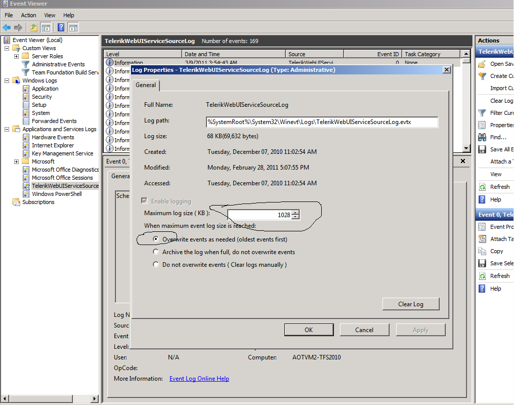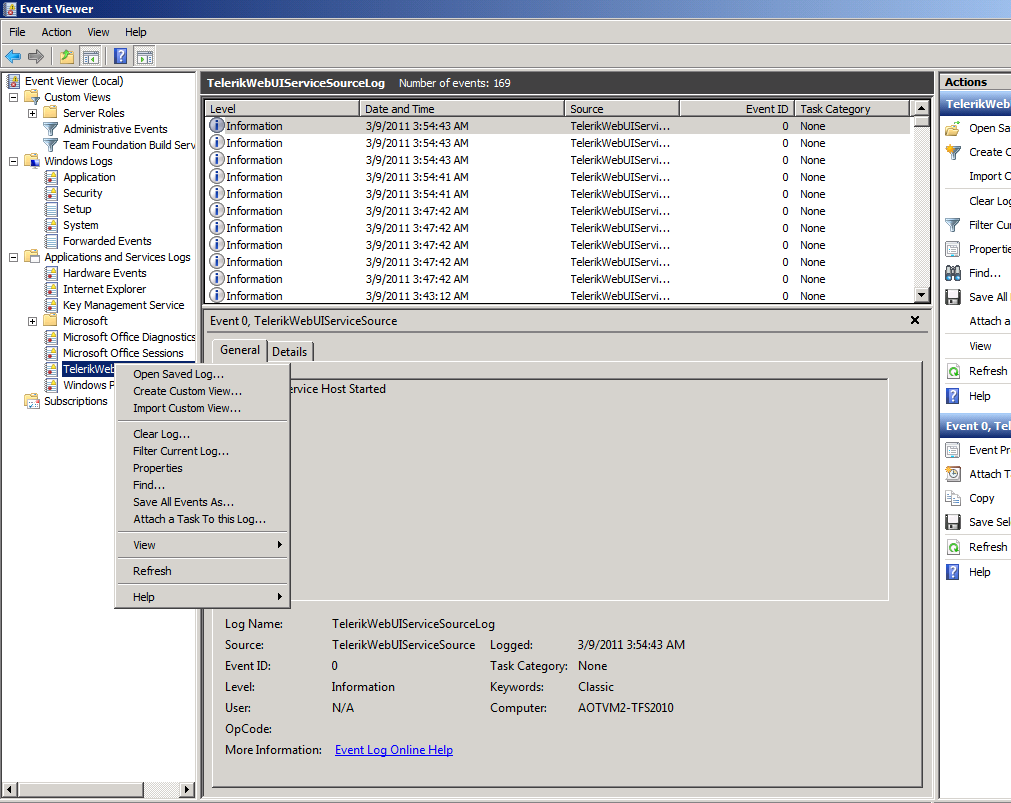 2. Find in the Applications and Services Logs section TelerikWebUIServiceSourceLog