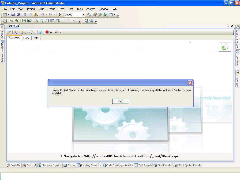 Now moving further, if I open any of the .aii file recorded earlier it shows me an error message displaying 'Do you want to upgrade the project with latest build installed'. After clicking 'Ok' I get the message like "Legacy project elements will be removed from project.However,the files may be still be in the source control or local disk." Please refer attached screen shot for reference.