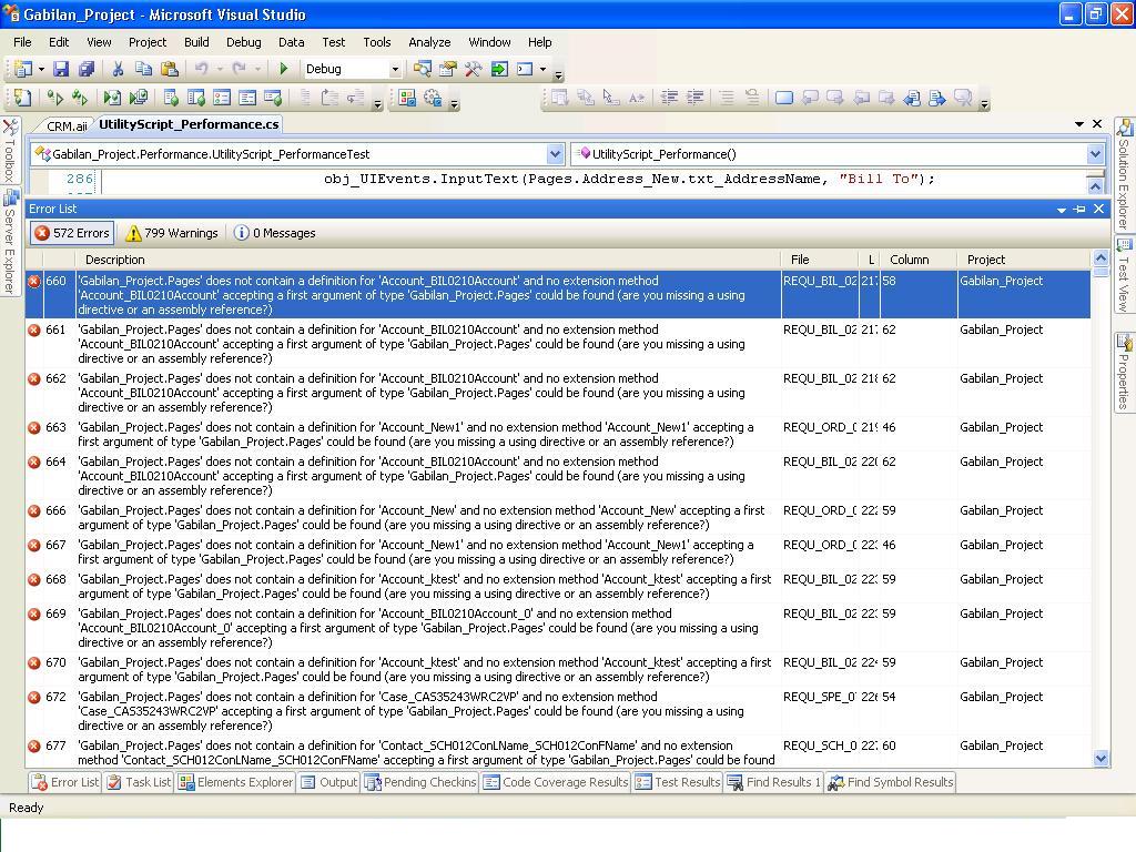 These errors like "Error 18 'Gabilan_Project.Pages' does not contain a definition for 'Case_CAS35243WRC2VP'" are a result of the Page merging that the product does in the new version. This element is being referenced in multiple tests where the page definitions are the same except for the friendly name. We now merge identical page definitions into one page in Elements Explorer and generate our Pages.g.cs based on the newly merged elements. The old version didn't perform this automatic merging of elements, which was causing Elements Explorer to be unnecessarily cluttered.