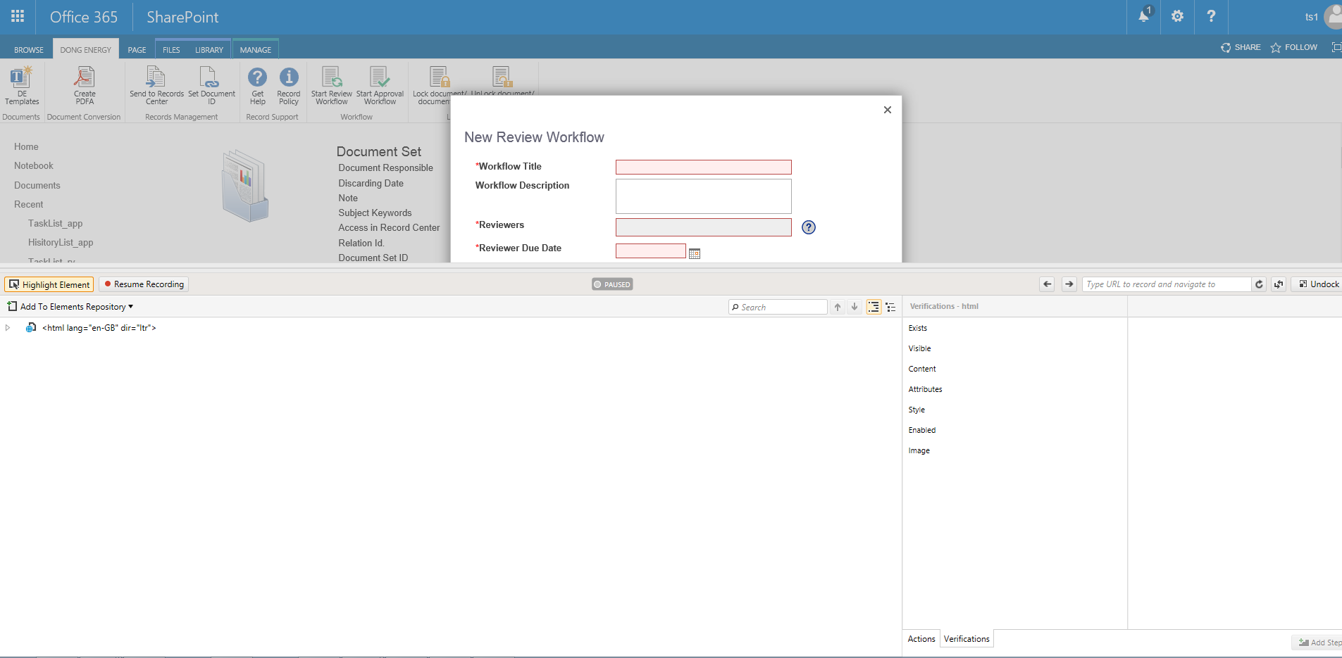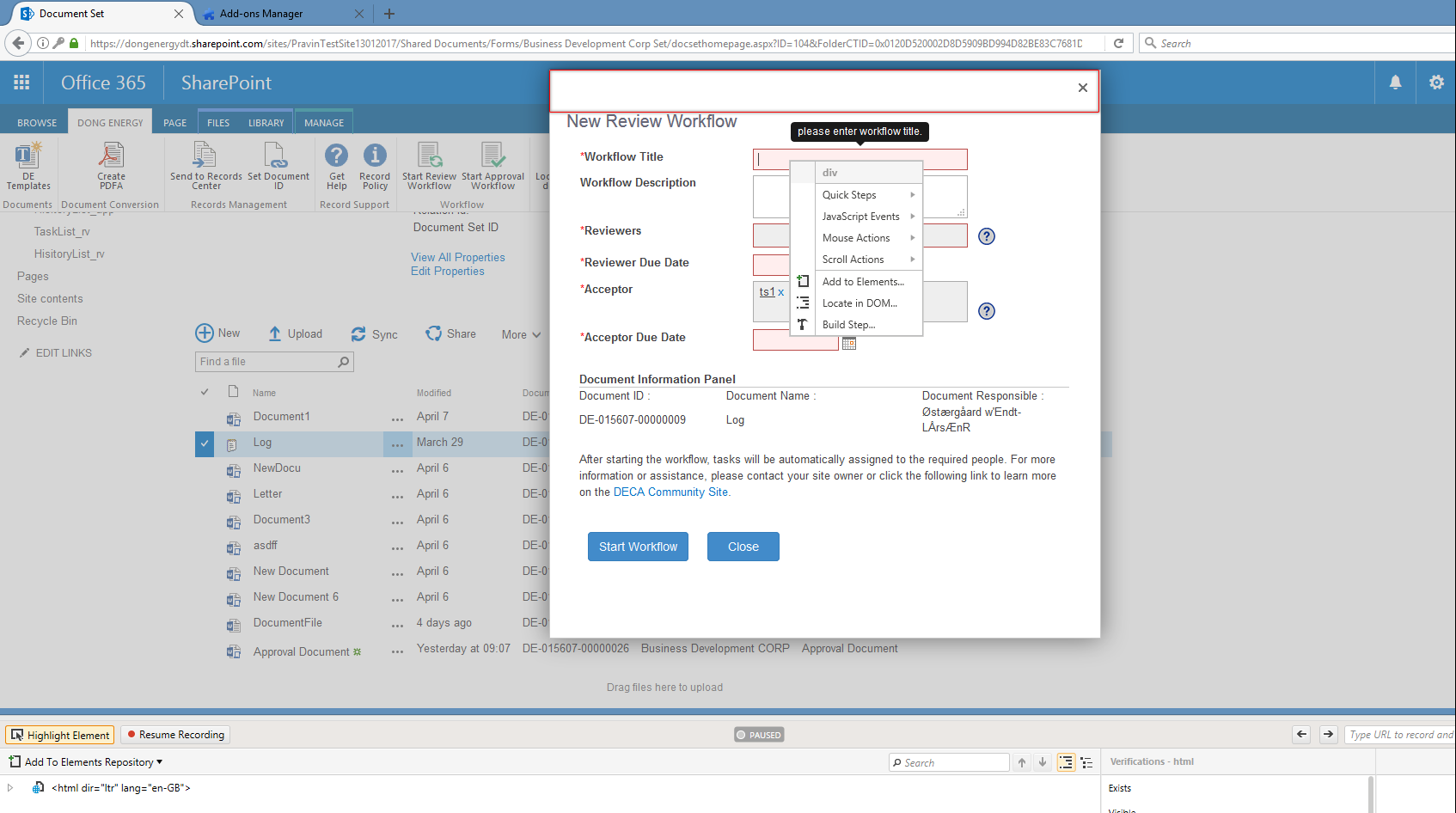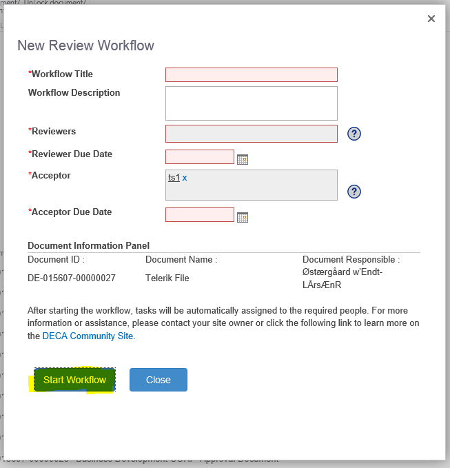 5) Click Start Workflow.Required fields will then be highlighted in red (StartWorkflow.PNG)