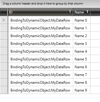 I'm binding my GridView to a custom report class with records. The `Report`class has a list of field types that is not known until runtime. It exposes an array of `Record` objects. The Record class derives from System::DynamicObject. Binding an IEnumerable<Record> to GridView is pretty easy with the AutoGenerateColumns turned on. (Note this code is C++/CLI but the client code that uses it is C#/WPF/XAML)