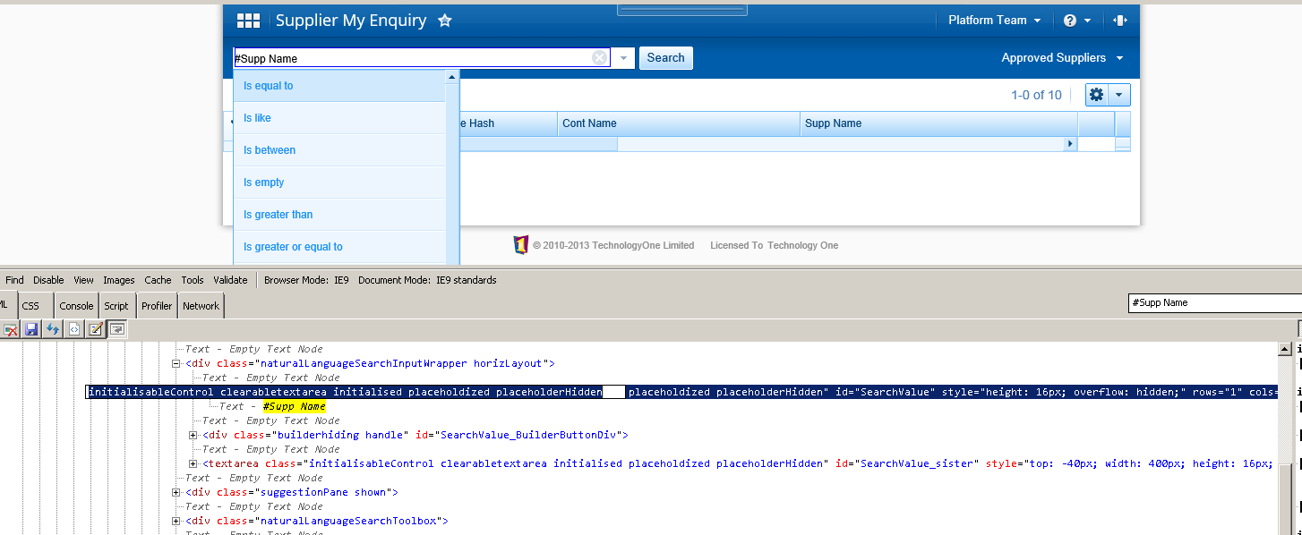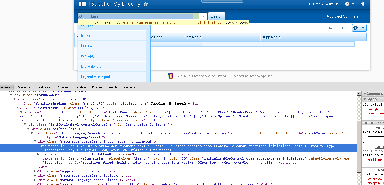 In Chrome, I entered text "#Supp Name" in the text area and I inspect the element 'SearchValueTextArea' , this is what I see