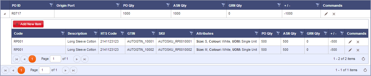 @{ ViewBag.Controller = "POs"; ViewBag.TemplateController = "POLines"; ViewBag.Area = "KOKO";}@(Html.Kendo().Grid<PO>() .Name("PurchaseOrderList") .HtmlAttributes(new { @class = "grid nowrap" }) .ToolBar(commands => { commands.Create() .Text(Html.ButtonsResource("AddPurchaseOrder")) .HtmlAttributes(new { @class = "t-add" }); }) .Columns(columns => { columns .Bound(x => x.OriginPortId) .Hidden(); columns .Bound(x => x.PONumber) .Title(Html.PropertiesResource("PO.PONumber")); columns .Bound(x => x.OriginPortName) .EditorViewData(new { Action = "GetFilteredPortByVendorOrFactory", Controller = "DataSource", onData = "onInlinePortOfOrigin", onSelect = "onInlinePortSelectById" }) .EditorTemplateName("InlineAutoComplete") .Title(Html.PropertiesResource("PO.OriginPortId")); columns .Bound(x => x.TotalPOQuantity) .Title(Html.PropertiesResource("PO.TotalPOQuantity")); columns .Bound(x => x.TotalASNQuantity) .Title(Html.PropertiesResource("PO.TotalASNQuantity")); columns .Bound(x => x.TotalGRNQuantity) .Title(Html.PropertiesResource("PO.TotalGRNQuantity")); columns .Bound(x => x.Variance) .Title(Html.PropertiesResource("PO.Variance")); columns.Command(commands => { commands .Edit() .HtmlAttributes((new { title = Html.ButtonsResource("Edit") })); commands .Destroy() .HtmlAttributes((new { title = Html.ButtonsResource("Delete") })); } ) .Width("5%") .HtmlAttributes(new { @class = "nowrap" }) .Title(Html.StringsResource("Commands")); }) .PrefixUrlParameters(false) .ClientDetailTemplateId("asnPurchaseOrderLineTemplate") .EnableCustomBinding(true) .Sortable(x => x.SortMode(GridSortMode.SingleColumn)) .Filterable() .Events(events => events .Save("SaveASNPurchaseOrder") .DataBound("KendoGrid.DataBound") .Edit("KendoGrid.Edit")) .DataSource(dataSource => dataSource .Ajax() .Model(model => { model .Id(x => x.Id); model .Field(x => x.TotalPOQuantity) .Editable(false); model .Field(x => x.TotalASNQuantity) .Editable(false); model .Field(x => x.TotalGRNQuantity) .Editable(false); model .Field(x => x.Variance) .Editable(false); }) .Events(e => e .Error("KendoGrid.Error") .RequestEnd("KendoGrid.RequestEnd")) .Create(create => create.Action("Add", (String)ViewBag.Controller, new { area = (String)(ViewBag.Area ?? String.Empty) })) .Read(read => read.Action("Index", (String)ViewBag.Controller, new { area = (String)(ViewBag.Area ?? String.Empty), ASNId = Request[Constants.ASNId] })) .Update(create => create.Action("Update", (String)ViewBag.Controller, new { area = (String)(ViewBag.Area ?? String.Empty) })) .Destroy(create => create.Action("Remove", (String)ViewBag.Controller, new { area = (String)(ViewBag.Area ?? String.Empty) })) .PageSize(((DataSourceRequest)ViewData[Constants.Request]).PageSize) ) .Pageable(pager => pager .Input(true) .Refresh(true) ))<script> function SaveASNPurchaseOrder(e) { e.model.UrlMask = GetUrlMask(); e.model.ASNId = '@ViewContext.RouteData.Values[Constants.ASNId]'; }</script><script id="asnPurchaseOrderLineTemplate" type="text/kendo-tmpl"> @(Html.Kendo().Grid<POLines>() .Name("productLines_#=Id#") .HtmlAttributes(new { @class = "grid nowrap" }) .ToolBar(commands => { commands.Create() .Text(Html.ButtonsResource("AddItem")) .HtmlAttributes(new { @class = "t-add" }); }) .Columns(columns => { columns .Bound(x => x.ProductMasterGTINId) .Hidden(); columns .Bound(x => x.Code) .EditorViewData(new { Action = "GetCompleteProduct", Controller = "DataSource", onSelect = "onProductDetailSelectById", onData = "onProductDataById" }) .EditorTemplateName("InlineAutoCompleteProductAndGTIN") .Width(300); columns .Bound(x => x.Description) .EditorTemplateName("InlineString") .EditorViewData(new { disabled = "disabled" }) .Title(Html.PropertiesResource("POLines.Description")); columns .Bound(x => x.HTSCode) .EditorTemplateName("InlineString") .EditorViewData(new { disabled = "disabled" }) .Title(Html.PropertiesResource("POLines.HTSCode")); columns .Bound(x => x.GTIN) .EditorTemplateName("InlineString") .EditorViewData(new { disabled = "disabled" }) .Title(Html.PropertiesResource("POLines.GTIN")); columns .Bound(x => x.SKU) .EditorTemplateName("InlineString") .EditorViewData(new { disabled = "disabled" }) .Title(Html.PropertiesResource("POLines.SKU")); columns .Bound(x => x.Attributes) .EditorTemplateName("InlineString") .EditorViewData(new { disabled = "disabled" }) .ClientTemplate("\\#= Attributes \\#") .Title(Html.PropertiesResource("ProductMasterGTINViewModel.AttributeString")); columns .Bound(x => x.POQuantity) .Title(Html.PropertiesResource("POLines.POQuantity")); columns .Bound(x => x.ASNQuantity) .Title(Html.PropertiesResource("POLines.ASNQuantity")); columns .Bound(x => x.GRNQuantity) .Title(Html.PropertiesResource("POLines.GRNQuantity")); columns .Bound(x => x.Variance) .Title(Html.PropertiesResource("POLines.Variance")); columns.Command(commands => { commands .Edit() .HtmlAttributes((new { title = Html.ButtonsResource("Edit") })); commands .Destroy() .HtmlAttributes((new { title = Html.ButtonsResource("Delete") })); } ) .Width("5%") .HtmlAttributes(new { @class = "nowrap" }) .Title(Html.StringsResource("Commands")); }) .PrefixUrlParameters(false) .Events(events => events .Save("SavePurchaseOrderProductLine") .DataBound("KendoGrid.DataBound") .Edit("KendoGrid.Edit")) .Sortable(x => x.SortMode(GridSortMode.SingleColumn)) .Editable(x => x.Mode(GridEditMode.InLine)) .Filterable() .DataSource(dataSource => dataSource .Ajax() .Model(model => { model.Id(x => x.Id); model.Field(x => x.GRNQuantity).Editable(false); model.Field(x => x.Variance).Editable(false); }) .Events(e => e .Error("KendoGrid.Error") .RequestEnd("KendoGrid.RequestEnd")) .Create(create => create.Action("Add", (String)ViewBag.TemplateController, new { area = (String)(ViewBag.Area ?? String.Empty), PurchaseOrderId = "#=Id#" })) .Read(read => read.Action("Index", (String)ViewBag.TemplateController, new { area = (String)(ViewBag.Area ?? String.Empty), PurchaseOrderId = "#=Id#" })) .Update(create => create.Action("Update", (String)ViewBag.Tem