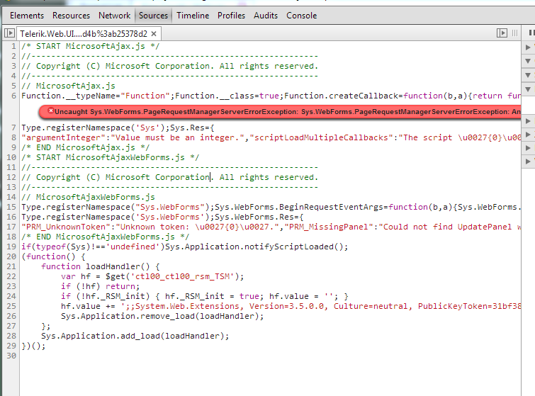 Uncaught Sys.WebForms.PageRequestManagerServerErrorException: Sys.WebForms.PageRequestManagerServerErrorException: An unknown error occurred while processing the request on the server. The status code returned from the server was: 500 Telerik.Web.UI.WebResource.axd?_TSM_HiddenField_=ctl00_ctl00_rsm_TSM&compre…e35%3aen-US%3a7263e9c6-5962-41bc-b839-88b704bfcf0d%3aea597d4b%3ab25378d2:6Error.create Telerik.Web.UI.WebResource.axd?_TSM_HiddenField_=ctl00_ctl00_rsm_TSM&compre…e35%3aen-US%3a7263e9c6-5962-41bc-b839-88b704bfcf0d%3aea597d4b%3ab25378d2:6Sys.WebForms.PageRequestManager._createPageRequestManagerServerError Telerik.Web.UI.WebResource.axd?_TSM_HiddenField_=ctl00_ctl00_rsm_TSM&compre…35%3aen-US%3a7263e9c6-5962-41bc-b839-88b704bfcf0d%3aea597d4b%3ab25378d2:15Sys.WebForms.PageRequestManager._parseDelta Telerik.Web.UI.WebResource.axd?_TSM_HiddenField_=ctl00_ctl00_rsm_TSM&compre…35%3aen-US%3a7263e9c6-5962-41bc-b839-88b704bfcf0d%3aea597d4b%3ab25378d2:15Sys.WebForms.PageRequestManager._onFormSubmitCompleted Telerik.Web.UI.WebResource.axd?_TSM_HiddenField_=ctl00_ctl00_rsm_TSM&compre…35%3aen-US%3a7263e9c6-5962-41bc-b839-88b704bfcf0d%3aea597d4b%3ab25378d2:15(anonymous function) Telerik.Web.UI.WebResource.axd?_TSM_HiddenField_=ctl00_ctl00_rsm_TSM&compre…e35%3aen-US%3a7263e9c6-5962-41bc-b839-88b704bfcf0d%3aea597d4b%3ab25378d2:6(anonymous function) Telerik.Web.UI.WebResource.axd?_TSM_HiddenField_=ctl00_ctl00_rsm_TSM&compre…e35%3aen-US%3a7263e9c6-5962-41bc-b839-88b704bfcf0d%3aea597d4b%3ab25378d2:6Sys.Net.WebRequest.completed Telerik.Web.UI.WebResource.axd?_TSM_HiddenField_=ctl00_ctl00_rsm_TSM&compre…e35%3aen-US%3a7263e9c6-5962-41bc-b839-88b704bfcf0d%3aea597d4b%3ab25378d2:6_onReadyStateChange Telerik.Web.UI.WebResource.axd?_TSM_HiddenField_=ctl00_ctl00_rsm_TSM&compre…e35%3aen-US%3a7263e9c6-5962-41bc-b839-88b704bfcf0d%3aea597d4b%3ab25378d2:6Any ideas how I should try to trouble shoot this? Is it a page lifecycle issue?
