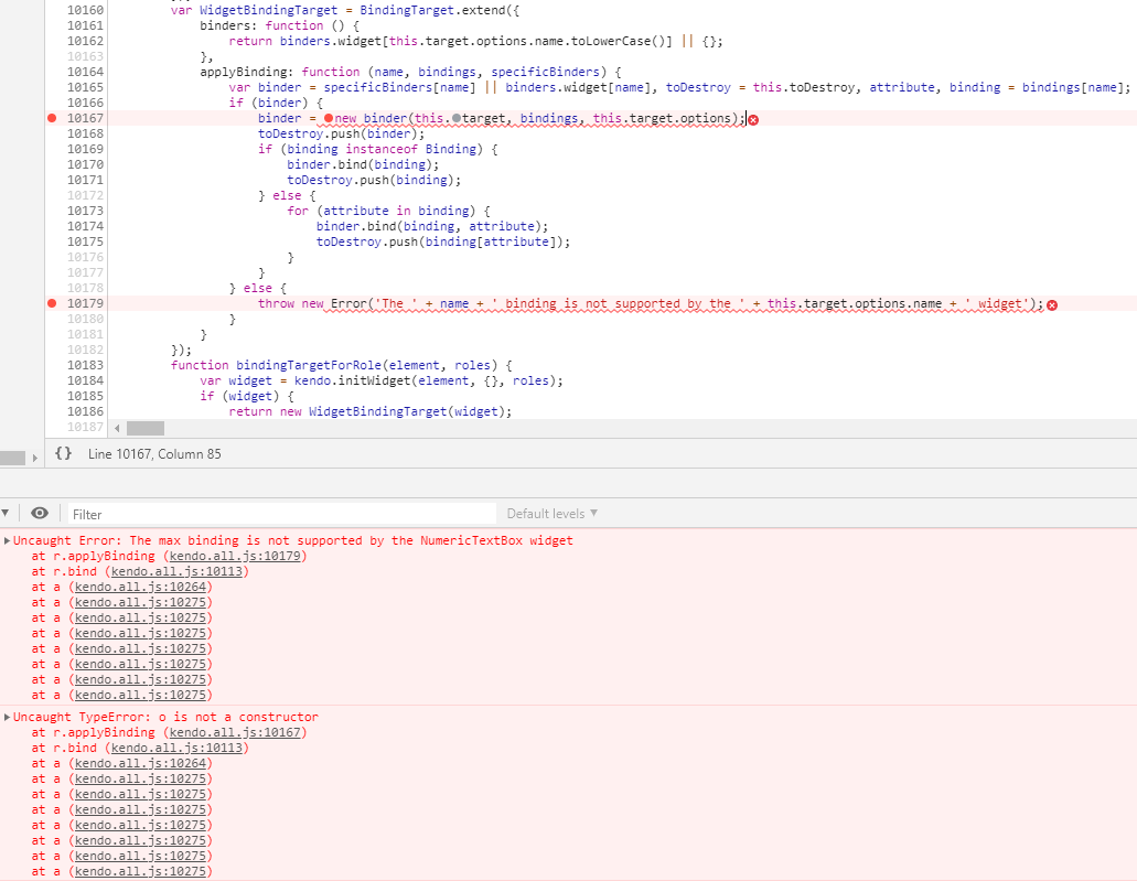 However, when I implement the provided code on this article https://docs.telerik.com/kendo-ui/framework/mvvm/bindings/custom#custom-widget-binding-in-typescript - Custom Widget Binding I got an exception when applyBinding function is called in kendo.all.js. Please see screen shot attached.