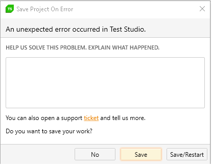 Presently am running 2016.2.630.0 version of the telerik test studio.An Unexpected Error occured in Test Studio" and after save test studio crashes .can you please help on resolving this error.