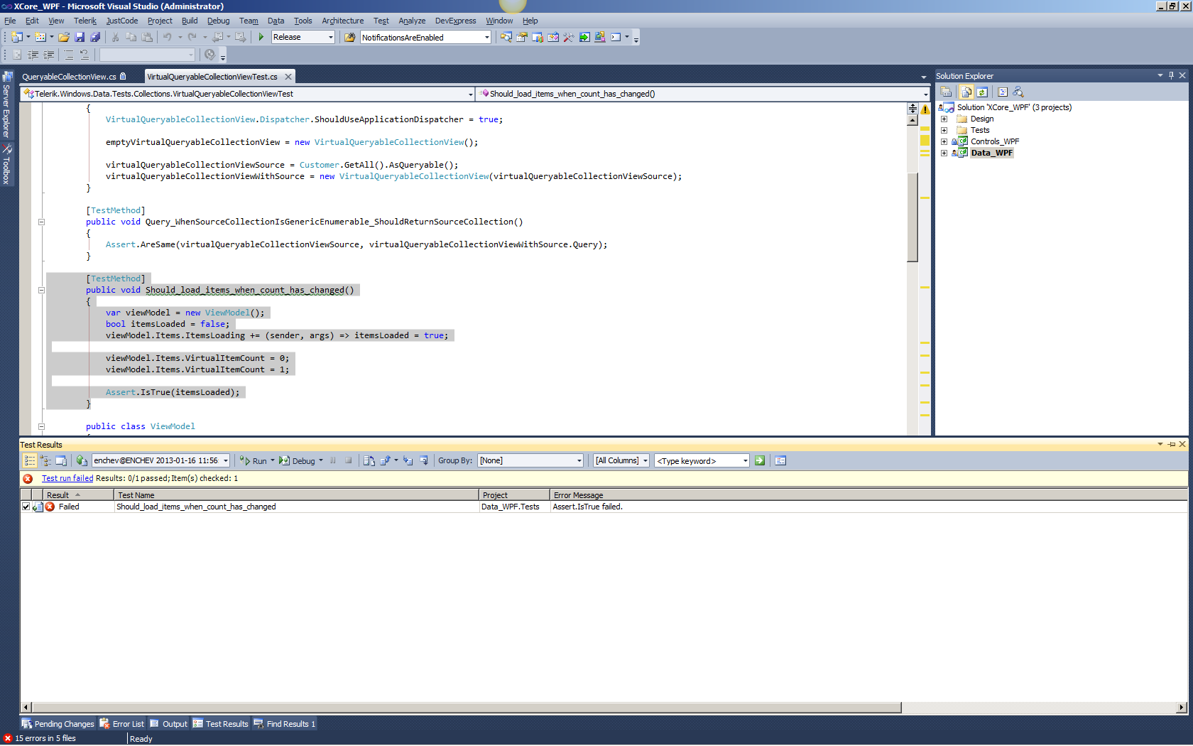 using NUnit.Framework;using Telerik.Windows.Data;namespace TelerikTester{ [TestFixture] public class VirtualQueryableCollectionViewTester { [Test] public void Should_load_items_when_count_has_changed() { var viewModel = new ViewModel(); bool itemsLoaded = false; viewModel.Items.ItemsLoading += (sender, args) => itemsLoaded = true; viewModel.Items.VirtualItemCount = 0; viewModel.Items.VirtualItemCount = 1; Assert.That(itemsLoaded, Is.True); } } public class ViewModel { public VirtualQueryableCollectionView<object> Items { get; set; } public ViewModel() { Items = new VirtualQueryableCollectionView<object>(); } }}I've tried your test however the test just failed - no exceptions. I've attached screenshot for reference. I'm not using NUnit however - maybe this is causing the difference.