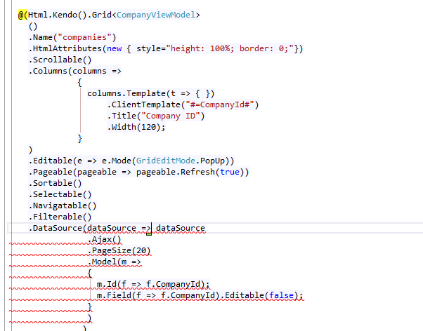 The trouble I am having is that I have red lines in the editing on everything from the first dataSource all the way to the end. When I hover over the start of the error I get the pop up description: C#: Unknown method 'DataSource(?)' of 'Kendo.Mvc.UI.Fluent.....