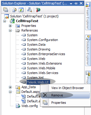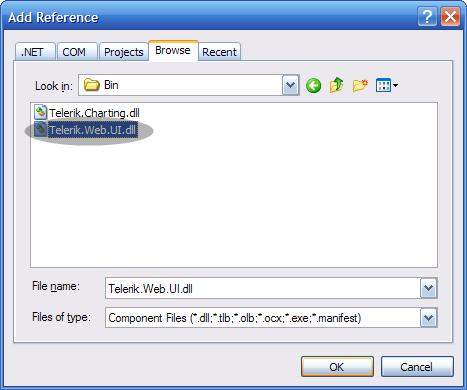 Daniel, VS is not displaying a references folder. So in VS I chose "Add reference" from the "Website" menu and browsed existing references. The only Telerik reference I saw was under the .NET tab and it was "Telerik.Charting" version 2.0.3.0. I did not remove this.