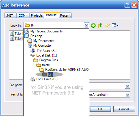 I followed your screen shots to add a reference to "Telerik.Web.UI.dll" from the BIN35 folder. That reference now shows on the "Recent" tab (but not on the .NET tab) as version 2008.2.723.35.