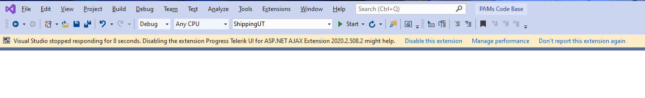 Extension 'Telerik UserSettings VSExtension 2.1' likely cuased 9 seconds of unresponsiveness. Disabling it may improve your experience.