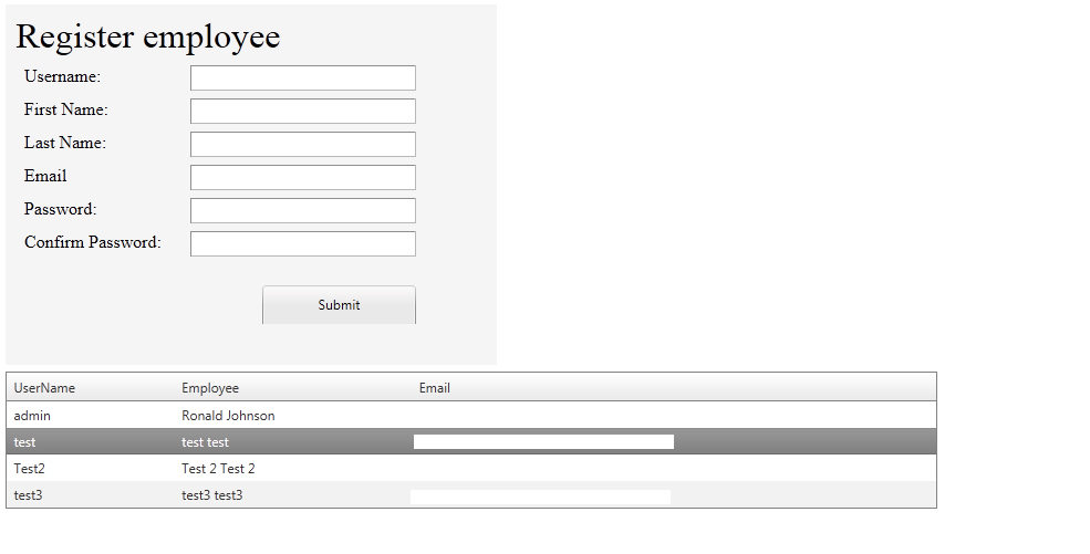 Can someone help me understand how to display newly inserted row in rad grid after successfully inserting? I have a register employee form and a radgrid on the same page. after I click submit and the user was sucessully created, how would I display that new user in the grid? I tried user the ajax manager to update the grid but no luck. I'll attach a screen shot to give a better idea.