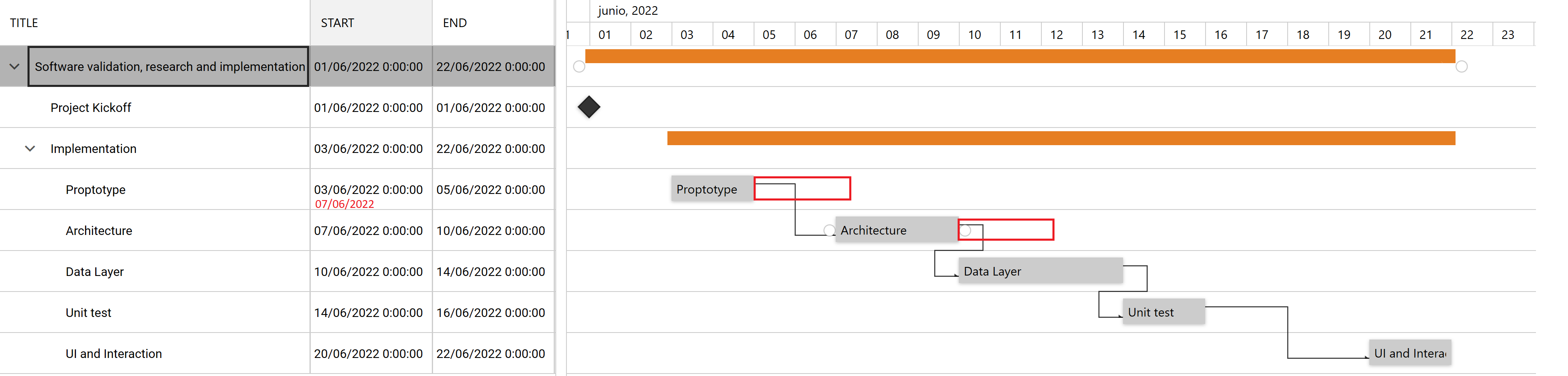I've also prepared a small sample project to demonstrate this in action. You can change the End time of the "Design public API" task and notice that if you add a few days/hours to it, the rest of the tasks will be updated accordingly.