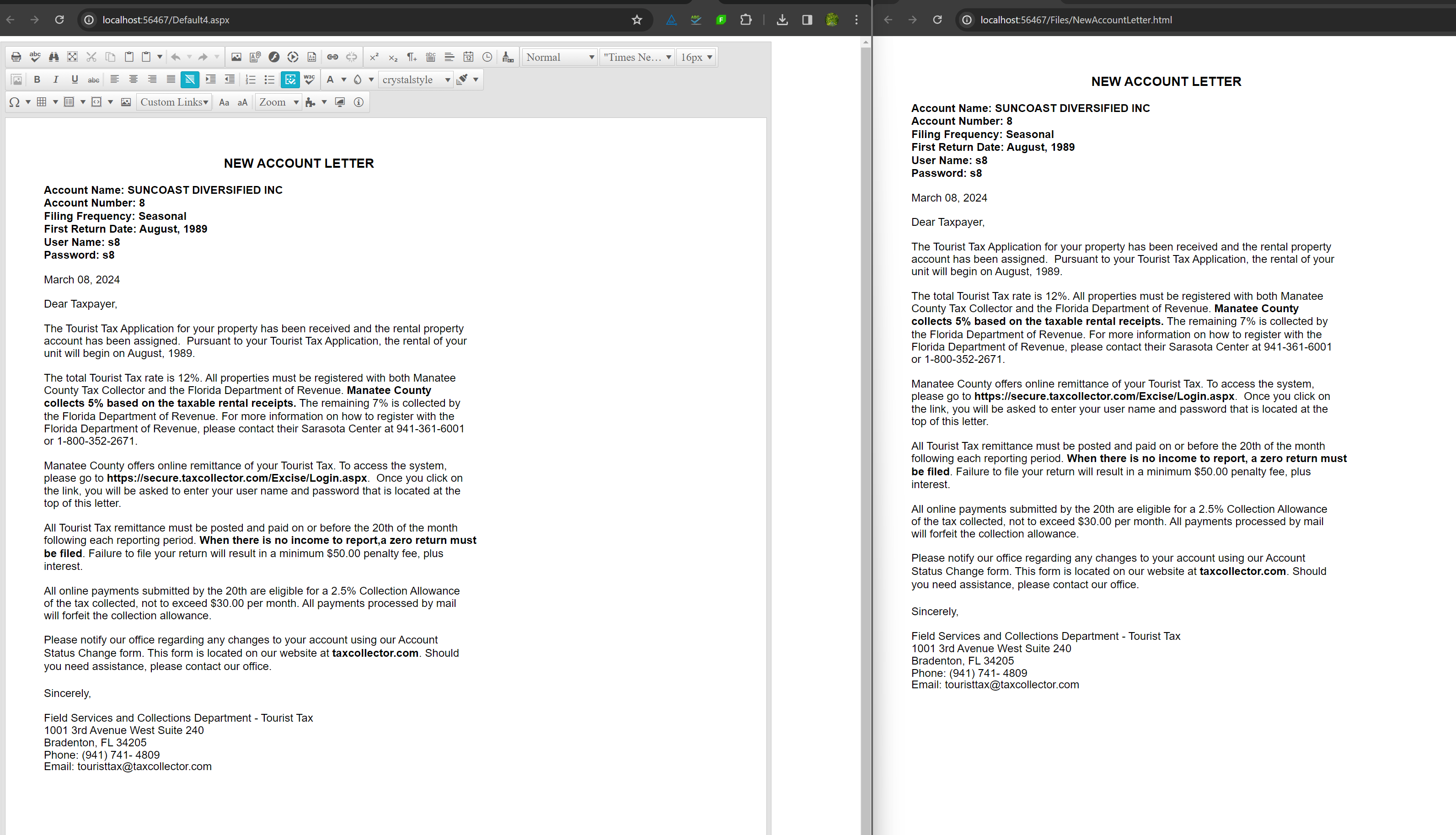 <div nowrap style="position:relative;padding-left:1px;"><div style="position:relative;line-height:22px;"><span class="fc56e533e6-7ff2-4fcc-82b5-72e72b5eb693-0"> </span><span class="fc56e533e6-7ff2-4fcc-82b5-72e72b5eb693-0"> </span><span class="fc56e533e6-7ff2-4fcc-82b5-72e72b5eb693-0"> </span><span class="fc56e533e6-7ff2-4fcc-82b5-72e72b5eb693-0"> </span><span class="fc56e533e6-7ff2-4fcc-82b5-72e72b5eb693-0"> </span><span class="fc56e533e6-7ff2-4fcc-82b5-72e72b5eb693-0"> </span><span class="fc56e533e6-7ff2-4fcc-82b5-72e72b5eb693-0"> </span><span class="fc56e533e6-7ff2-4fcc-82b5-72e72b5eb693-0"> </span><span class="fc56e533e6-7ff2-4fcc-82b5-72e72b5eb693-0"> </span><span class="fc56e533e6-7ff2-4fcc-82b5-72e72b5eb693-1"> </span><span class="fc56e533e6-7ff2-4fcc-82b5-72e72b5eb693-1"> </span><span class="fc56e533e6-7ff2-4fcc-82b5-72e72b5eb693-1"> </span><span class="fc56e533e6-7ff2-4fcc-82b5-72e72b5eb693-1">NEW ACCOUNT LETTER</span></div></div><div nowrap style="position:relative;padding-left:1px;"><div style="position:relative;line-height:18px;"><span class="fc56e533e6-7ff2-4fcc-82b5-72e72b5eb693-1"> </span></div></div><div nowrap style="position:relative;padding-left:1px;"><div style="position:relative;line-height:19px;"><span class="fc56e533e6-7ff2-4fcc-82b5-72e72b5eb693-0">Account Name: SUNCOAST DIVERSIFIED INC</span></div></div><div nowrap style="position:relative;padding-left:1px;"><div style="position:relative;line-height:19px;"><span class="fc56e533e6-7ff2-4fcc-82b5-72e72b5eb693-0">Account Number: 8</span></div></div><div nowrap style="position:relative;padding-left:1px;"><div style="position:relative;line-height:19px;"><span class="fc56e533e6-7ff2-4fcc-82b5-72e72b5eb693-0">Filing Frequency: Seasonal</span></div></div><div nowrap style="position:relative;padding-left:1px;"><div style="position:relative;line-height:19px;"><span class="fc56e533e6-7ff2-4fcc-82b5-72e72b5eb693-0">First Return Date: August, 1989</span></div></div><div nowrap style="position:relative;padding-left:1px;"><div style="position:relative;line-height:19px;"><span class="fc56e533e6-7ff2-4fcc-82b5-72e72b5eb693-0">User Name: s8</span></div></div><div nowrap style="position:relative;padding-left:1px;"><div style="position:relative;line-height:19px;"><span class="fc56e533e6-7ff2-4fcc-82b5-72e72b5eb693-0">Password: s8</span></div></div><div nowrap style="position:relative;padding-left:1px;"><div style="position:relative;line-height:17px;"><span class="fc56e533e6-7ff2-4fcc-82b5-72e72b5eb693-0"> </span></div></div><div nowrap style="position:relative;padding-left:1px;"><div style="position:relative;line-height:18px;"><span class="fc56e533e6-7ff2-4fcc-82b5-72e72b5eb693-4">March 08, 2024</span></div></div><div nowrap style="position:relative;padding-left:1px;"><div style="position:relative;line-height:17px;"><span class="fc56e533e6-7ff2-4fcc-82b5-72e72b5eb693-4"> </span></div></div><div nowrap style="position:relative;padding-left:1px;"><div style="position:relative;line-height:18px;"><span class="fc56e533e6-7ff2-4fcc-82b5-72e72b5eb693-4">Dear Taxpayer,</span></div></div><div nowrap style="position:relative;padding-left:1px;"><div style="position:relative;line-height:18px;"><span class="fc56e533e6-7ff2-4fcc-82b5-72e72b5eb693-4"> </span></div></div><div nowrap style="position:relative;padding-left:1px;"><div style="position:relative;line-height:18px;"><span class="fc56e533e6-7ff2-4fcc-82b5-72e72b5eb693-4">The Tourist Tax Application for your property has been received and the rental property </span></div></div><div nowrap style="position:relative;padding-left:1px;"><div style="position:relative;line-height:18px;"><span class="fc56e533e6-7ff2-4fcc-82b5-72e72b5eb693-4">account has been assigned. Pursuant to your Tourist Tax Application, the rental of your </span></div></div><div nowrap style="position:relative;padding-left:1px;"><div style="position:relative;line-height:18px;"><span class="fc56e533e6-7ff2-4fcc-82b5-72e72b5eb693-4">unit will begin on August, 1989.</span></div></div><div nowrap style="position:relative;padding-left:1px;"><div style="position:relative;line-height:18px;"><span class="fc56e533e6-7ff2-4fcc-82b5-72e72b5eb693-4"> </span></div></div><div nowrap style="position:relative;padding-left:1px;"><div style="position:relative;line-height:18px;"><span class="fc56e533e6-7ff2-4fcc-82b5-72e72b5eb693-4">The total Tourist Tax rate is 12%. All properties must be registered with both Manatee </span></div></div><div nowrap style="position:relative;padding-left:1px;"><div style="position:relative;line-height:19px;"><span class="fc56e533e6-7ff2-4fcc-82b5-72e72b5eb693-4">County Tax Collector and the Florida Department of Revenue.</span><span class="fc56e533e6-7ff2-4fcc-82b5-72e72b5eb693-0"> Manatee County </span></div></div><div nowrap style="position:relative;padding-left:1px;"><div style="position:relative;line-height:19px;"><span class="fc56e533e6-7ff2-4fcc-82b5-72e72b5eb693-0">collects 5% based on the taxable rental receipts.</span><span class="fc56e533e6-7ff2-4fcc-82b5-72e72b5eb693-4"> The remaining 7% is collected by </span></div></div><div nowrap style="position:relative;padding-left:1px;"><div style="position:relative;line-height:18px;"><span class="fc56e533e6-7ff2-4fcc-82b5-72e72b5eb693-4">the Florida Department of Revenue. For more information on how to register with the </span></div></div><div nowrap style="position:relative;padding-left:1px;"><div style="position:relative;line-height:18px;"><span class="fc56e533e6-7ff2-4fcc-82b5-72e72b5eb693-4">Florida Department of Revenue, please contact their Sarasota Center at 941-361-6001 </span></div></div><div nowrap style="position:relative;padding-left:1px;"><div style="position:relative;line-height:18px;"><span class="fc56e533e6-7ff2-4fcc-82b5-72e72b5eb693-4">or 1-800-352-2671.</span></div></div><div nowrap style="position:relative;padding-left:1px;"><div style="position:relative;line-height:18px;"><span class="fc56e533e6-7ff2-4fcc-82b5-72e72b5eb693-4"> </span></div></