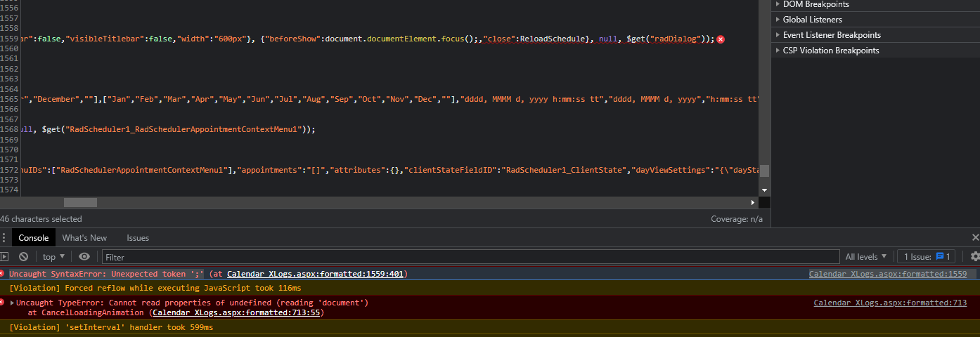 Calendar_XLogs.aspx:formatted:1559 Uncaught SyntaxError: Unexpected token ';'