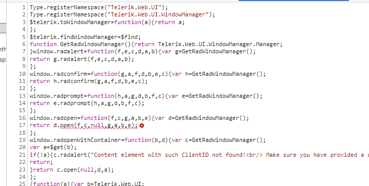 Another error is Uncaught TypeError: Cannot read properties of undefined (reading 'document') and it is due to an invalid reference returned by top.frames["ContentFrame"] inside the function StartLoadingAnimation. This is not related to the Telerik control.