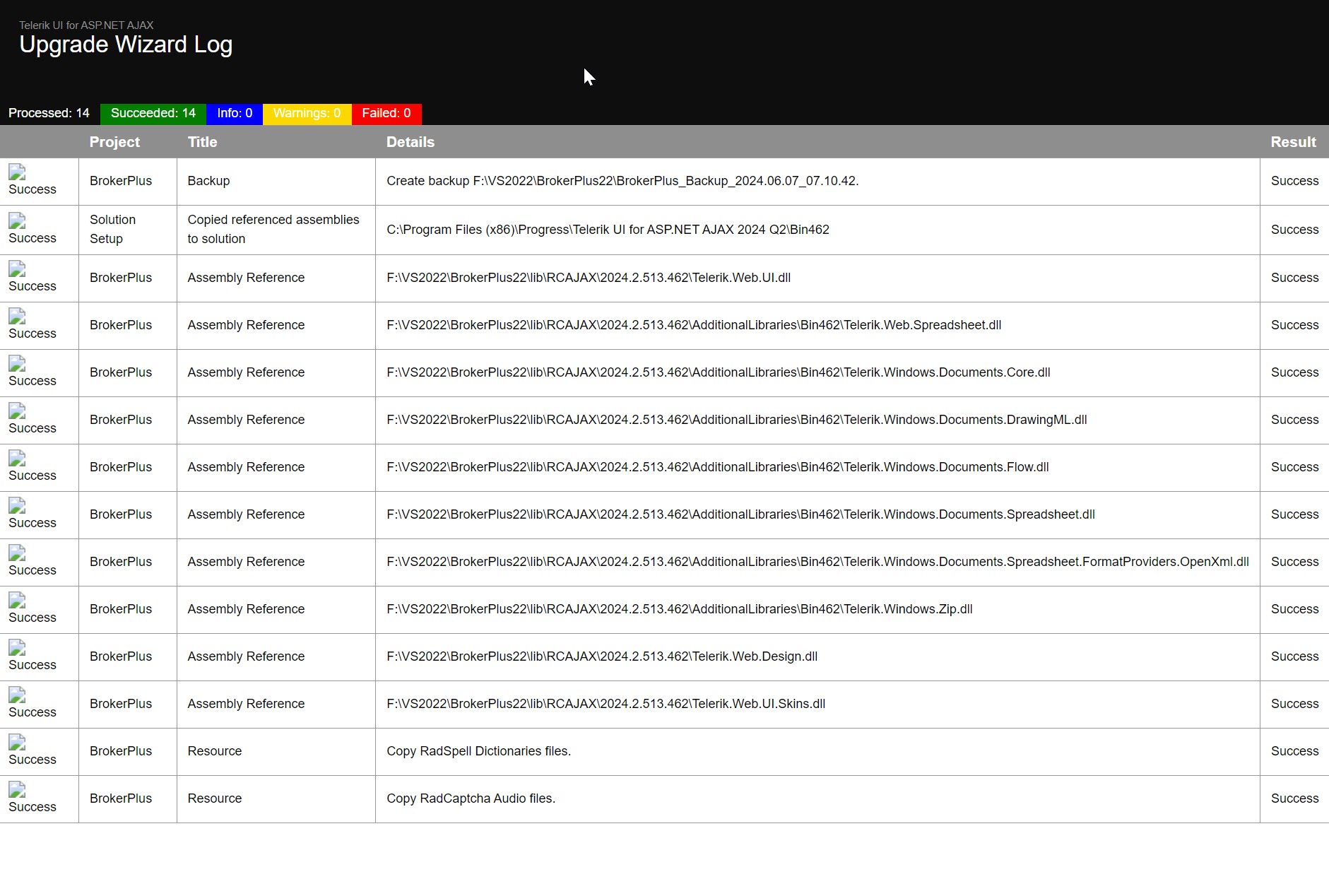 (6) I started poking around the solution references, web.config, etc. and I found an interesting item. In the solution/project's references to the Telerik.Web.UI I had the presence of mind to check the details of that particular reference. In my project (which I had not changed myself but the upgrade process had) the details of the reference were to "...\lib\RCAJAX\2024.2.513.462\Telerik.Web.UI.dll". The important point, as I was just about to learn, was that the detail pointer to the .dll file included "462" as the 4th level of the version number. Fortunately for me, my eyes picked that up because in the web.config file, I had entered "2024.2.513.135". So just to try it, I went back to the web.config file and entered "462" as the final part of the Telerik.Web.UI instead of "135".