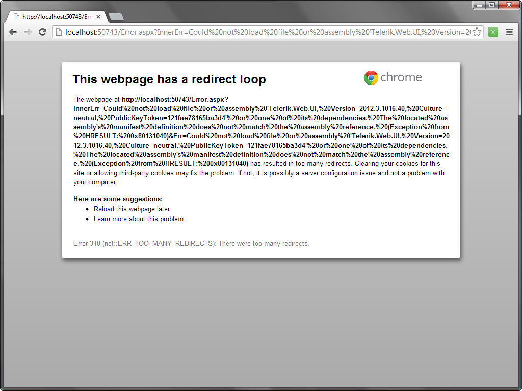 I just upgraded from Q3 to Q3 SP1 via Telerik Control Panel and in VS10 when I build & run, I get error in browsers with different errors. I'm attaching screen shots.