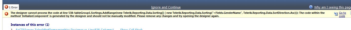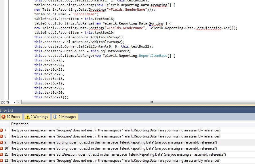 The problems are in a cross tab report. I commented out the lines causing the compilation errors and I was able to compile and also get the designer working but of course the cross tabs don't work properly now. Could you provide the code I could use to replace the errors manually in the designer .cs file So I can salvage the report?