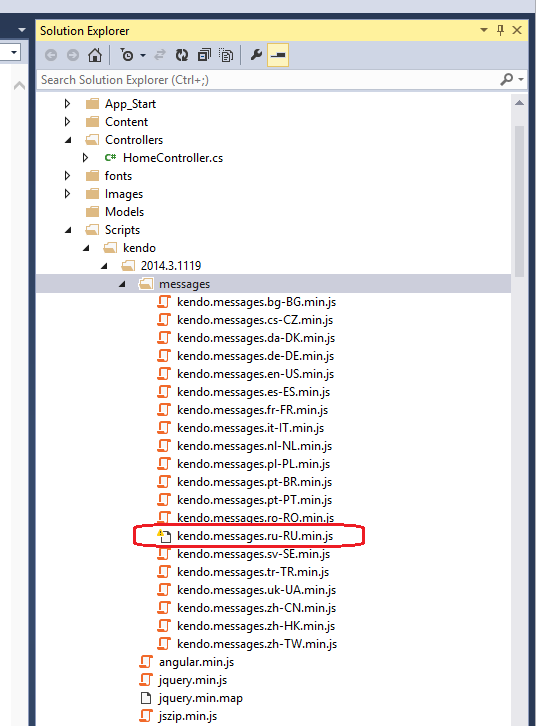 2. Under Scripts/kendo, the next folder was still 2014.3.1223 and all the files were reported as not existing in the project directory.