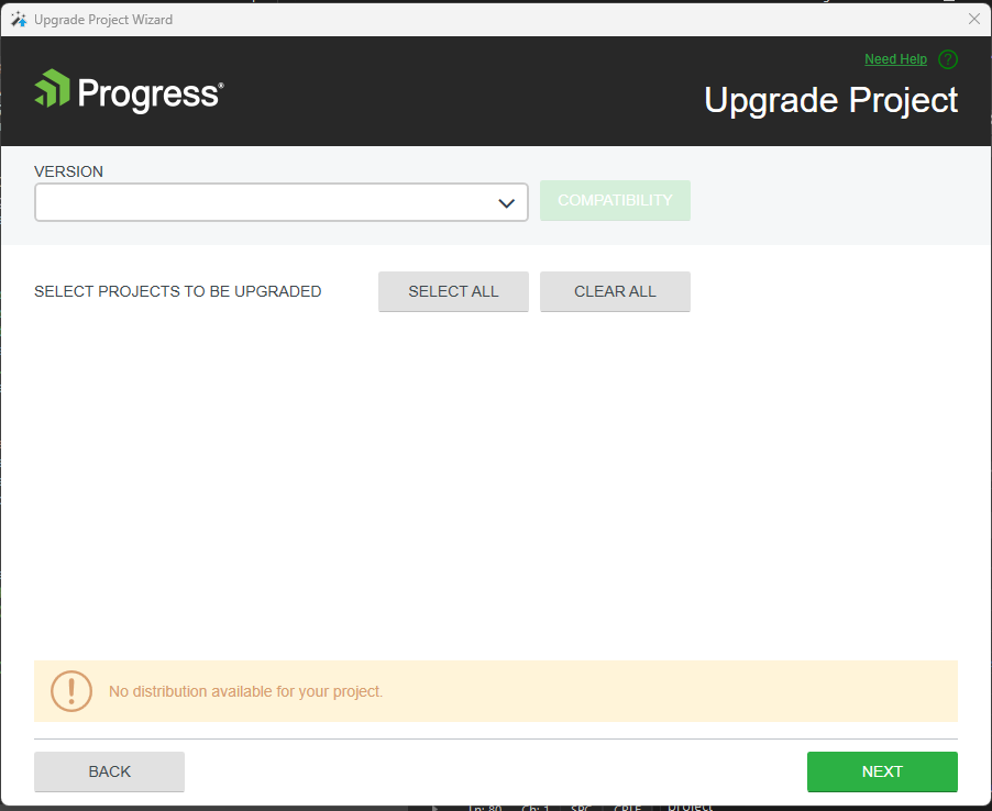 I am trying to upgrade a .NET 4.5 project using the Upgrade Wizard. However, when I attempt to use the wizard I am getting a message saying "No distribution available for your project" and there aren't any versions listed in the dropdown.