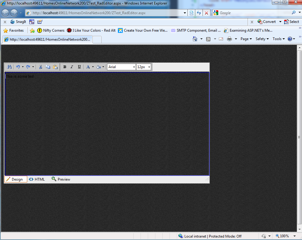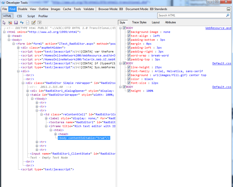 <%@ Page Language="VB" AutoEventWireup="true" CodeFile="ZTest_RadEditor.aspx.vb" Inherits="ZTest_RadEditor" %> <!DOCTYPE html PUBLIC "-//W3C//DTD XHTML 1.0 Transitional//EN" "http://www.w3.org/TR/xhtml1/DTD/xhtml1-transitional.dtd"> <html xmlns="http://www.w3.org/1999/xhtml"> <head runat="server"> <title></title> <link href="THDiStyles/Default.css" rel="stylesheet" type="text/css" /> </head> <body> <form id="form1" runat="server"> <telerik:RadScriptManager ID="RadScriptManager1" runat="server"> </telerik:RadScriptManager> <div> <br /><br /> <telerik:RadEditor ID="RadEditor1" runat="server" EnableEmbeddedSkins="true" Skin="Simple" ToolsFile="BasicTools.xml" > </telerik:RadEditor> <br /><br /> </div> </form> </body> </html> I have uploaded screen captures of: