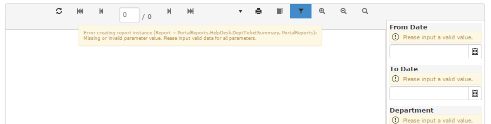 I recently upgraded from Q1 2014 to Q2 2015 and now I am having issues on any reports that I prompt for parameters. In the past when I opened the report, I would get an error, but the user could enter the parameters and then properly run the report (See ss1.png). Now I just get an error and no parameters (see ss2.png). Here is what I use for my display code in my MVC Razor page: