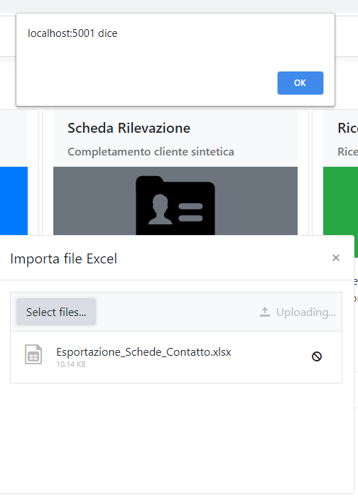 <!-- >> IMPORT EXCEL-->@{Html.Kendo().Window() .Name("importExcelFileWindow") .Title("Importa file Excel") .Width(500) .Height(300) .Content(@<text> @using (Html.BeginForm("ImportExcelFile", "UploadContacts", FormMethod.Post)) { @(Html.Kendo().Upload() .Name("excelFiles") .Validation(v=>v.AllowedExtensions(new string[] { ".xlsx", ".xls" })) .Async(a => a .Save("Async_Save", "UploadContacts") .Remove("Async_Remove", "UploadContacts") .AutoUpload(true) ).Events(e=>e.Error("uploadError")) ) } </text>).Visible(false).Render();}<script>