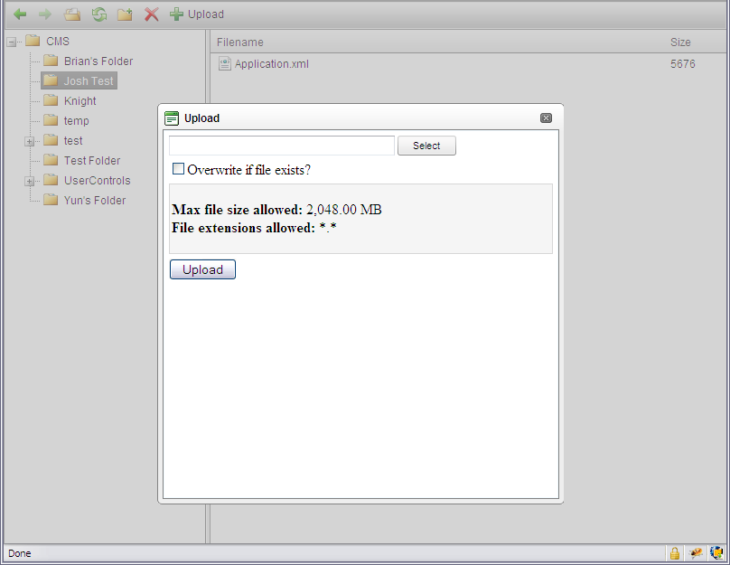 <telerik:RadFileExplorer runat="server" ID="RadFileExplorer1" Width="100%" Height="600" EnableAsyncUpload="true" > <Configuration SearchPatterns="*.*" MaxUploadFileSize="1073741824" ViewPaths="~/media/CMS/" UploadPaths="~/media/CMS/" /></telerik:RadFileExplorer>I can see the files, but when I get to the Async Upload window I cannot click on "select".