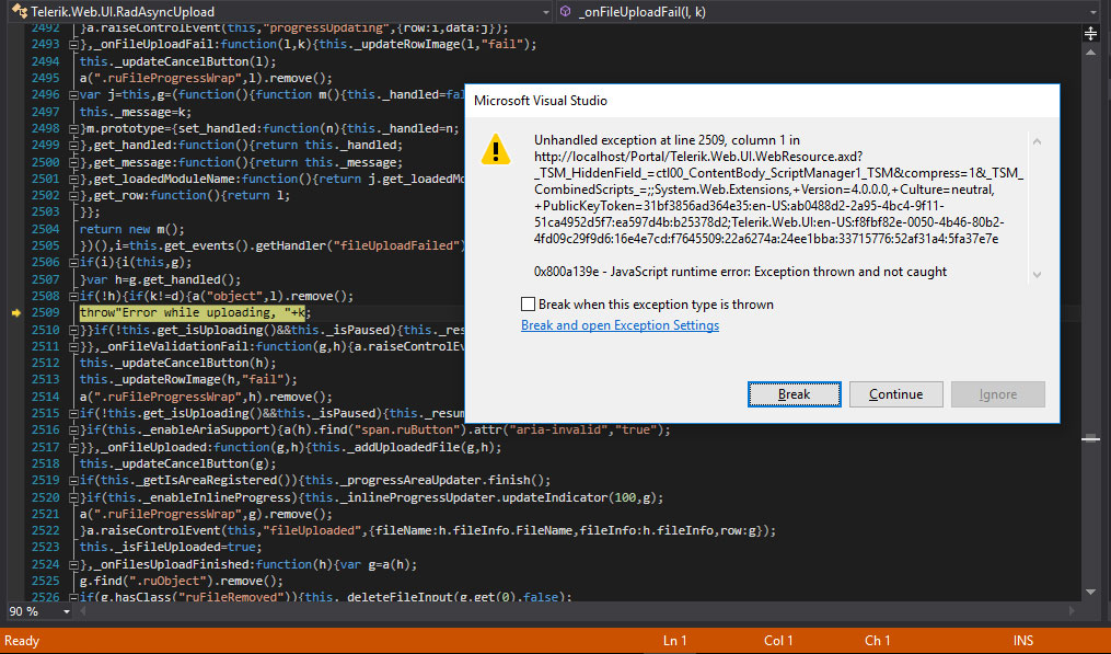 Unhandled exception at line 2509, column 1 in http://localhost/Portal/Telerik.Web.UI.WebResource.axd?_TSM_HiddenField_=ctl00_ContentBody_ScriptManager1_TSM&compress=1&_TSM_CombinedScripts_=;;System.Web.Extensions,+Version=4.0.0.0,+Culture=neutral,+PublicKeyToken=31bf3856ad364e35:en-US:ab0488d2-2a95-4bc4-9f11-51ca4952d5f7:ea597d4b:b25378d2;Telerik.Web.UI:en-US:f8fbf82e-0050-4b46-80b2-4fd09c29f9d6:16e4e7cd:f7645509:22a6274a:24ee1bba:33715776:52af31a4:5fa37e7e