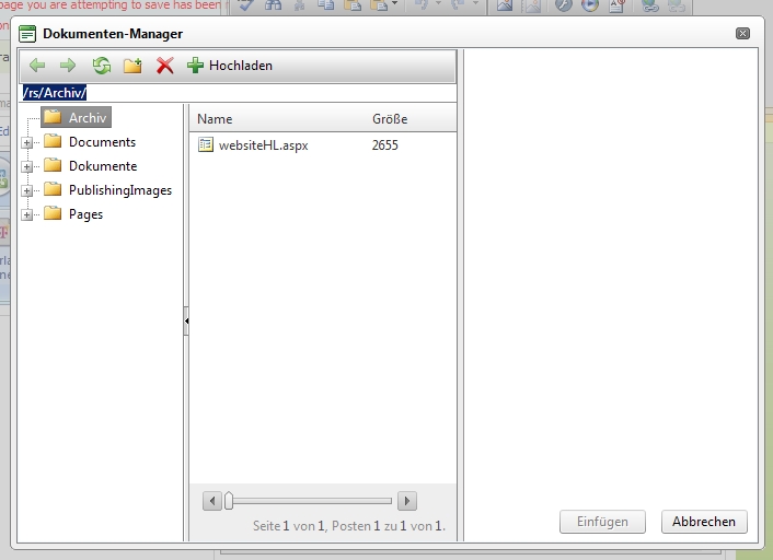 <property name="DocumentsPaths"> <item>/</item></property>Although if I don't set the DocumentsPaths property in the ConfigFile I can't navigate to the root site using the document managers address box. I am not able to delete the "/rs/Archiv" entry (see image attached).