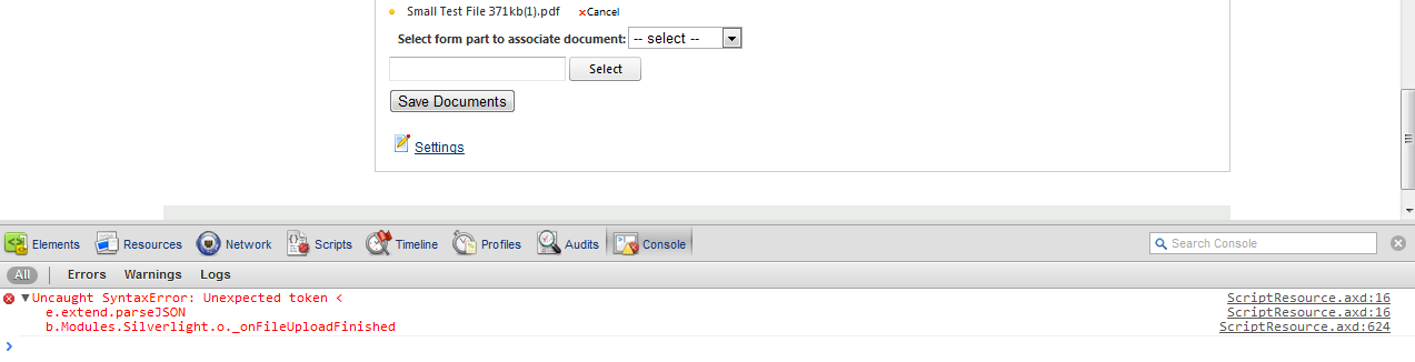 I seem to be having an related error. When I opened the Console in FireFox nothing appeared but it is still broken. I opening it in Google Chrome and I got this error "Uncaught SyntaxError: Unexpected token < ScriptResource.axd:16" I have attached a screen shot of the error.
