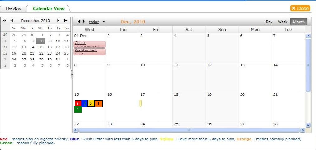 protected void RadScheduler1_AppointmentCreated(object sender, AppointmentCreatedEventArgs e) { Label lblRed = (Label)e.Container.FindControl("lblRed"); LinkButton lnkSubject = (LinkButton)e.Container.FindControl("lnkSubject"); lnkSubject.Text = clsGeneral.ShowSingleQuote(e.Appointment.Subject); //lnkSubject.Attributes.Add("onClick", "return DoFilter('" + e.Appointment.ID.ToString() + "','" + e.Appointment.Resources.GetResourceByType("OrderStatus").Text + "');"); lnkSubject.Attributes.Add("onclick", "return DisplayEventInformation(" + e.Appointment.ID.ToString() + " );"); lnkSubject.Attributes.Add("onmouseover", "javascript:ddrivetip('<b>Click here to manage this Event</b>',250);"); lnkSubject.Attributes.Add("onmouseout", "javascript:hideddrivetip();"); e.Appointment.ToolTip = ""; lblRed.Text = e.Appointment.Resources.GetResourceByType("OrderStatus").Text; } protected void RadScheduler1_AppointmentDataBound(object source, SchedulerEventArgs e) { Int64 OrderID = 0; OrderID = Convert.ToInt64(e.Appointment.ID); objOrders = objOrdersService.GetById(OrderID); DateTime dtOrder = Convert.ToDateTime(objOrders.OrderDate); DateTime dtStartOn = Convert.ToDateTime(e.Appointment.Start); DateTime dtToday = DateTime.Now; Int64 days = 0; Int64 days1 = 0; days = clsGeneral.DateDiff(clsGeneral.DateInterval.Hour, dtToday, dtStartOn); days = days / 24; days1 = clsGeneral.DateDiff(clsGeneral.DateInterval.Hour, dtOrder, dtStartOn); days1 = days1 / 24; //For the Highest Priority Order,Consider Today Date and StartUp Date //For the Rush Order,Consider the Order Date to Start Date Difference if (days1 <= 5) { e.Appointment.CssClass = "rsCategoryBlue"; } else { if (days <= 5) { e.Appointment.CssClass = "rsCategoryRed"; } else if (days > 5) { e.Appointment.CssClass = "rsCategoryYellow"; } } }Thanks