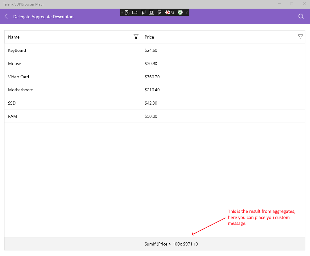 About the status message - you could use DataGrid Aggregates. They add a row in the DataGrid and you can display any custom message you want. I am sending you a link to our example: Aggregates Example. I am attaching an image as well to see the result from the example. You can also apply style to the aggregates: DataGrid Aggregates Styling.