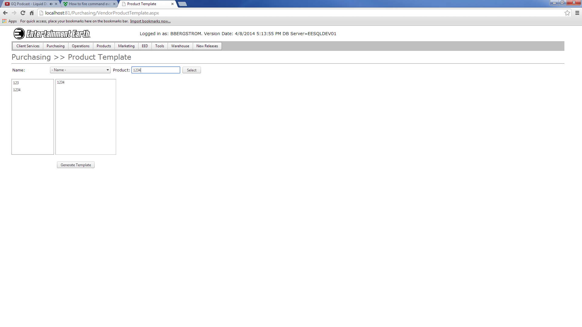 using System;using System.Collections.Generic;using System.Linq;using System.Web;using System.Web.UI;using System.Web.UI.WebControls;using Telerik.Web.UI;using System.Data.SqlClient;using System.Data;namespace EE.Intranet.Purchasing{ public partial class ProductTemplate : System.Web.UI.Page { protected void Page_Load(object sender, EventArgs e) { } protected void RbSelect_Click(object sender, EventArgs e) { RadTextBox1.Text = ProductTB.Text; RadListBox1.Items.Add(new RadListBoxItem(HttpUtility.HtmlEncode(ProductTB.Text.Trim()))); ProductTB.Text = string.Empty; } protected void RbGenerate_Click(object sender, EventArgs e) { /*using (SqlConnection conn = new SqlConnection("connection1")) { conn.Open(); SqlCommand comm = new SqlCommand("dbo.sp_Proccccc", conn); comm.CommandType = CommandType.StoredProcedure; comm.Parameters.Add(new SqlParameter("@Name", Name)); comm.Parameters.Add(new SqlParameter("@ProductNum", ProductNumber)); comm.ExecuteNonQuery(); conn.Close(); }*/ } }}I have also attached a pic of what my current page looks like.