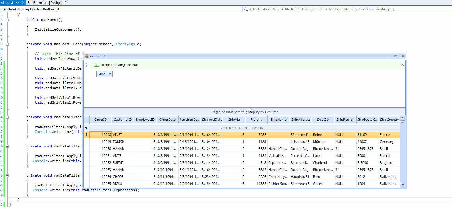 In order to add an expression to filter by a text column where the value is an empty string, you can use the Equals operator with an empty value. Please refer to the attached gif file which illustrates how to filter all rows where the ShipName property is an empty string or is null. I have attached my sample project for your reference. Additional information about getting started with RadDataFilter is available here: http://docs.telerik.com/devtools/winforms/datafilter/getting-started
