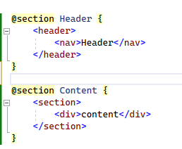 As you can see we are using RenderSection() to take the HTML defined in other view. For each page we have the following code