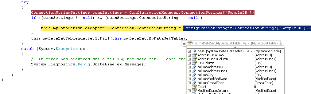 this.myDataSetTableAdapter1.Connection.ConnectionString = ConfigurationManager.ConnectionStrings["myConnectionString"].ConnectionString;