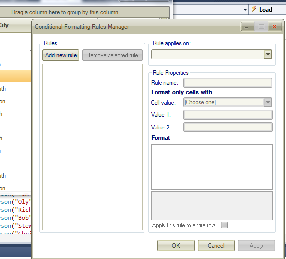 var conditionalFormattingForm = new ConditionalFormattingForm(this.radGridView1.MasterTemplate, null);conditionalFormattingForm.ThemeName = "Desert";conditionalFormattingForm.Owner = this.FindForm();conditionalFormattingForm.Show();And to use this from the grids's ContextMenu, you can just use the following: