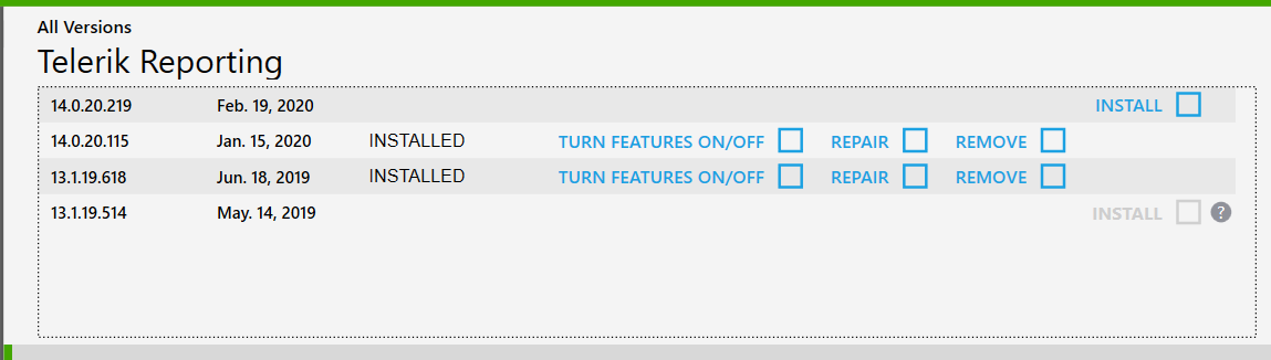 I have a Reporting Server (1. ReportingServerVersion.PNG) which does not open reports created with a version of Report Designer newer than 13.1.19.514. When I click button New Report on the server it offers me to download its compatible version of Report Designer (2. DownloadDesigner.png). However it downloads only an exe file so for this version I have neither an installation folder nor a configuration file. For some reason the control panel also does not allow me to install the older version (3. ControlPanel.PNG).