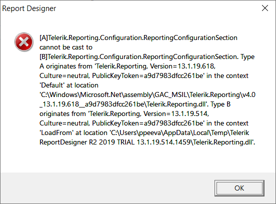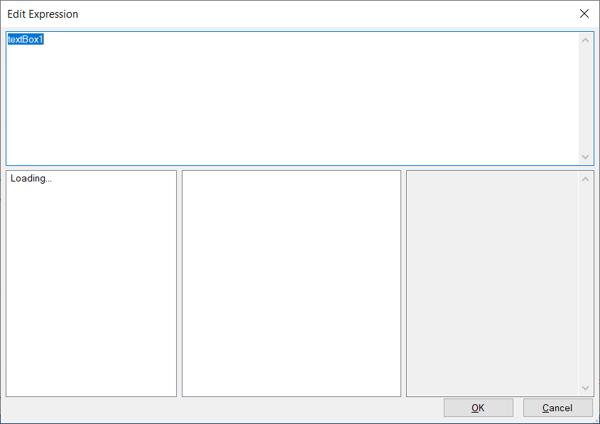 I copied the configuration file from the installation folder of Report Designer version 13.1.19.618 (I have successfully used it to load my custom functions). This config file references the dll with the custom functions. Report Designer 514 started successfully but when I try to open the Expression window of a textbox it shows a loading message (4. LoadingExpressionWindow.png) and after that crashes and closes with no error notification.