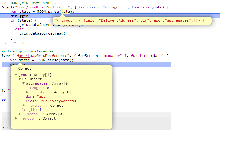 Also, to test out whether its the "state" value not being set correctly, i have tried to manually override this by using the exact values from when the "state" value was set. i.e. i have tried this grid.dataSource.query("{"group":[{"field":"Supplier","dir":"asc","aggregates":[]}]}")