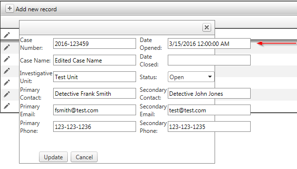 <body> <div></div> <form id="form1" runat="server"> <div> <asp:Label ID="Label1" runat="server" Text="Search Case Nunber: "></asp:Label> <asp:TextBox ID="txtSearchBox" runat="server"></asp:TextBox> <asp:Button ID="Button1" runat="server" Text="Go" OnClick="Button1_Click" /><br /><br /> </div> <telerik:RadScriptManager ID="RadScriptManager1" runat="server"></telerik:RadScriptManager> <telerik:RadAjaxManager ID="RadAjaxManager1" runat="server"> <AjaxSettings> <telerik:AjaxSetting AjaxControlID="RadGrid1"> <UpdatedControls> <telerik:AjaxUpdatedControl ControlID="RadGrid1" LoadingPanelID="RadAjaxLoadingPanel1"></telerik:AjaxUpdatedControl> </UpdatedControls> </telerik:AjaxSetting> <telerik:AjaxSetting AjaxControlID="ConfiguratorPanel"> <UpdatedControls> <telerik:AjaxUpdatedControl ControlID="RadGrid1" LoadingPanelID="RadAjaxLoadingPanel1"></telerik:AjaxUpdatedControl> </UpdatedControls> </telerik:AjaxSetting> </AjaxSettings> </telerik:RadAjaxManager> <telerik:RadAjaxLoadingPanel ID="RadAjaxLoadingPanel1" runat="server" Skin="Windows7"></telerik:RadAjaxLoadingPanel> <telerik:RadFormDecorator ID="RadFormDecorator1" runat="server" DecorationZoneID="Grid" DecoratedControls="All" EnableRoundedCorners="false" /> <div id="Grid" class="Grid-container"> <telerik:RadGrid ID="RadGridInvestigations" runat="server" AutoGenerateColumns="False" AllowPaging="True" AllowSorting="True" AllowAutomaticInserts="True" OnNeedDataSource="RadGridInvestigation_NeedDataSource" OnItemCreated="RadGridInvestigation_ItemCreated" OnUpdateCommand="RadGridInvestigation_UpdateCommand" OnInsertCommand="RadGridInvestigation_InsertCommand" Font-Size="Large"> <PagerStyle Mode="NextPrevNumericAndAdvanced" /> <MasterTableView EditMode="PopUp" AutoGenerateColumns="false" DataKeyNames="CaseID" GridLines="Horizontal" CommandItemDisplay="Top" NoMasterRecordsText="No Records matched your search return to the search page and try again." ShowFooter="False"> <EditFormSettings> <PopUpSettings Modal="False"/> </EditFormSettings> <Columns> <telerik:GridEditCommandColumn ButtonType="ImageButton"></telerik:GridEditCommandColumn> <telerik:GridBoundColumn DataField="CaseID" HeaderText="Case ID" ReadOnly="true" ForceExtractValue="Always" ConvertEmptyStringToNull="true" Display="false" UniqueName="CaseID" /> <telerik:GridBoundColumn DataField="CaseNumber" HeaderText="CaseNumber" UniqueName="CaseNumber" ReadOnly="false" Display="false"/> <telerik:GridHyperLinkColumn FilterControlAltText ="Filter CaseNumber column" Uniquename="CaseNumber" DataNavigateUrlFormatString ="~/InvWithTips.aspx?CaseNumber={0}" DataTextField="CaseNumber" HeaderText="Case Number" DataNavigateUrlFields="CaseNumber" SortExpression="CaseNumber" HeaderStyle-Wrap="false" > </telerik:GridHyperLinkColumn> <telerik:GridBoundColumn DataField="CaseName" HeaderText="Name" SortExpression="CaseName" UniqueName="CaseName" Display="True"> </telerik:GridBoundColumn> <telerik:GridBoundColumn DataField="InvestigativeUnit" HeaderText="Unit Assigned" SortExpression="InvestigativeUnit" UniqueName="InvestigativeUnit" HeaderStyle-Wrap="True"> </telerik:GridBoundColumn> <telerik:GridBoundColumn DataField="PrimaryContact" HeaderText="PrimaryContact" SortExpression="PrimaryContact" UniqueName="PrimaryContact"> </telerik:GridBoundColumn> <telerik:GridBoundColumn DataField="PrimaryContactEmail" HeaderText="PrimaryContactEmail" SortExpression="PrimaryContactEmail" UniqueName="PrimaryContactEmail"> </telerik:GridBoundColumn> <telerik:GridBoundColumn DataField="PrimaryContactPhone" HeaderText="Primary Phone" SortExpression="PrimaryContactPhone" UniqueName="PrimaryContactPhone"> </telerik:GridBoundColumn> <telerik:GridBoundColumn DataField="SecondaryContact" HeaderText="2nd Contact" SortExpression="PrimaryContact" UniqueName="SecondaryContact"> </telerik:GridBoundColumn> <telerik:GridBoundColumn DataField="SecondaryEmail" HeaderText="2nd Email" SortExpression="SecondaryEmail" UniqueName="SecondaryEmail"> </telerik:GridBoundColumn> <telerik:GridBoundColumn DataField="SecondaryPhone" HeaderText="2nd Phone" SortExpression="SecondaryPhone" UniqueName="SecondaryPhone"> </telerik:GridBoundColumn> <telerik:GridBoundColumn DataField="DateOpened" HeaderText="DateOpened" SortExpression="DateOpened" UniqueName="DateOpened" DataFormatString="{0:dd/MM/yyyy}"> </telerik:GridBoundColumn> <telerik:GridBoundColumn DataField="Status" HeaderText="Status" SortExpression="Status" UniqueName="Status"> </telerik:GridBoundColumn> <telerik:GridBoundColumn DataField="DateClosed" HeaderText="DateClosed" SortExpression="DateClosed" UniqueName="DateClosed" DataFormatString="{0:dd/MM/yyyy}"> </telerik:GridBoundColumn> </Columns> <EditFormSettings UserControlName="InvestigationDetailsControl.ascx" EditFormType="WebUserControl" PopUpSettings-Width="400px"> <EditColumn UniqueName="EditCommandColumn1" ></EditColumn> </EditFormSettings> </MasterTableView> </telerik:RadGrid> </div> <telerik:RadInputManager runat="server" ID="RadInputManager1" Enabled="true"> <telerik:TextBoxSetting BehaviorID="TextBoxSetting1"> </telerik:TextBoxSetting> </telerik:RadInputManager> <telerik:RadWindowManager ID="RadWindowManager1" runat="server" /> </form></body>Any help would be great